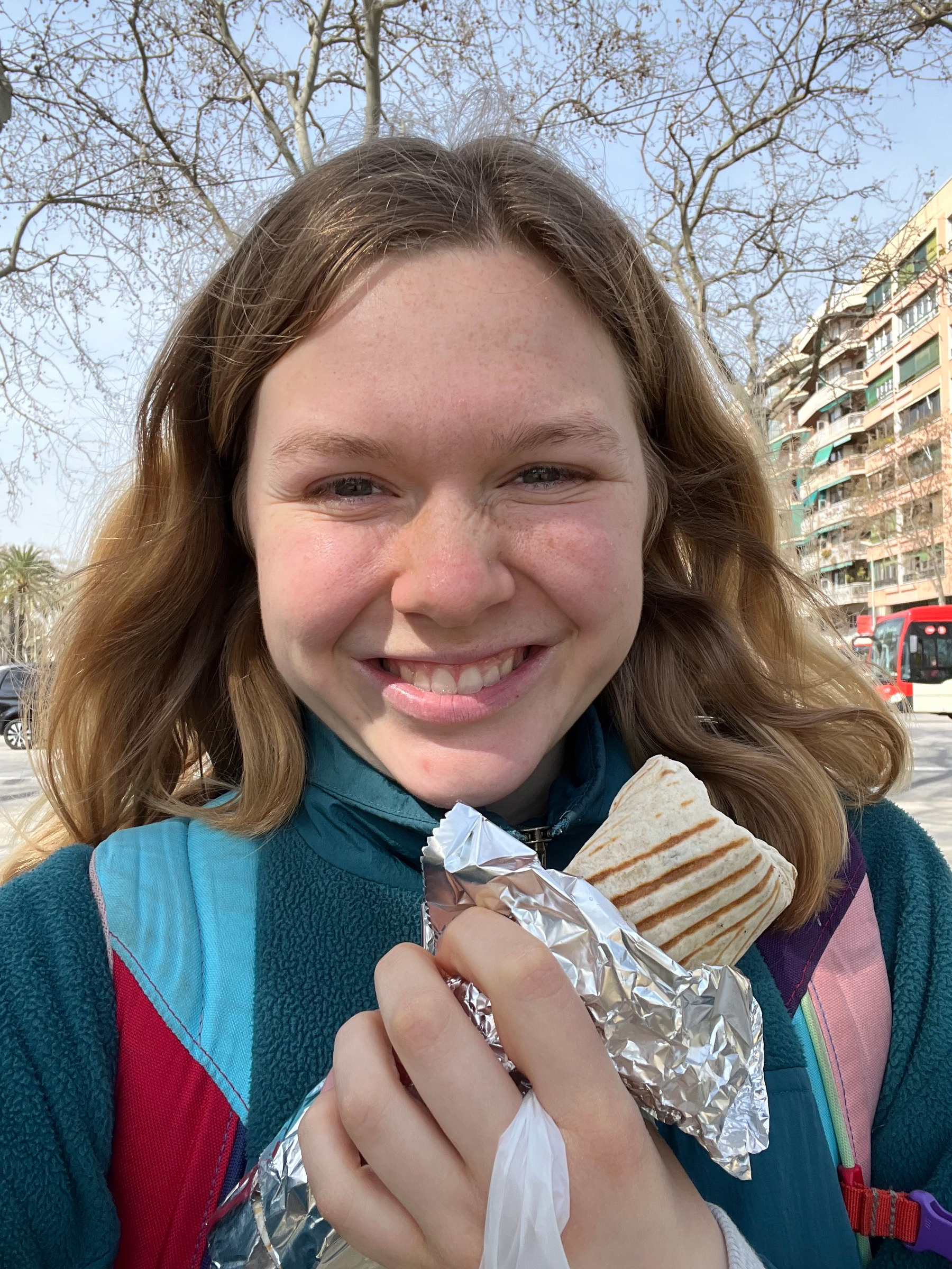 - Photo 4: Me with my Turkish kebab at Parc de la Ciutadella on Wednesday. I like this one because I just look so happy!